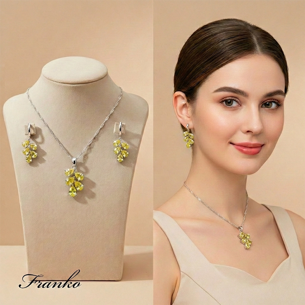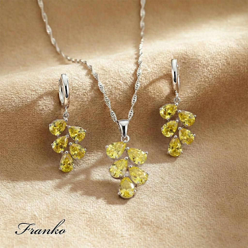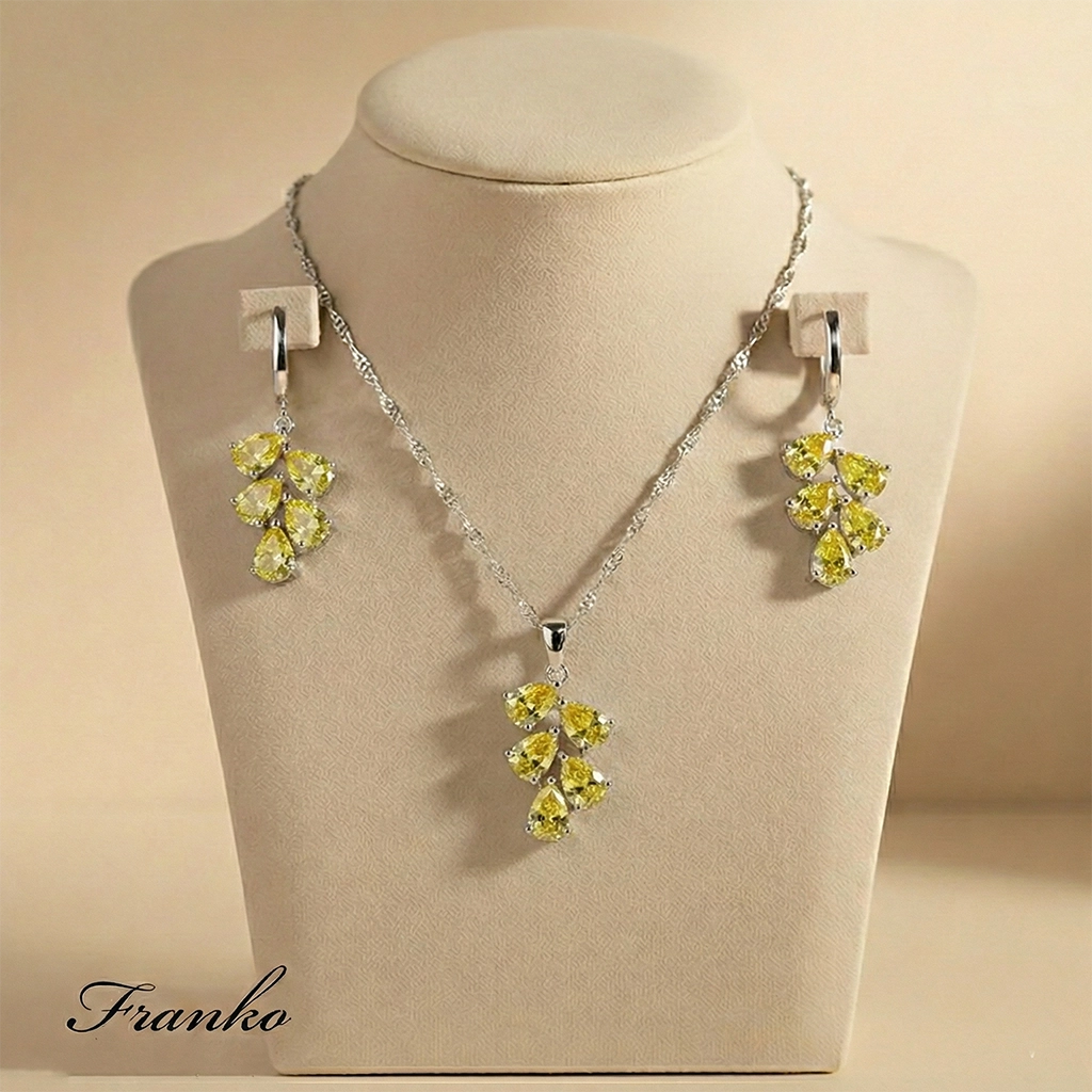 Design, który zachwyca Głównym elementem zestawu są precyzyjnie szlifowane kamienie w kształcie subtelnych łezek (gruszek). Ułożone w kunsztowną, kaskadową kompozycję, pięknie odbijają światło przy każdym ruchu, tworząc efektowną grę barw. Całość zawieszona jest na delikatnym, skręcanym łańcuszku, który idealnie dopełnia ten wyrafinowany projekt.