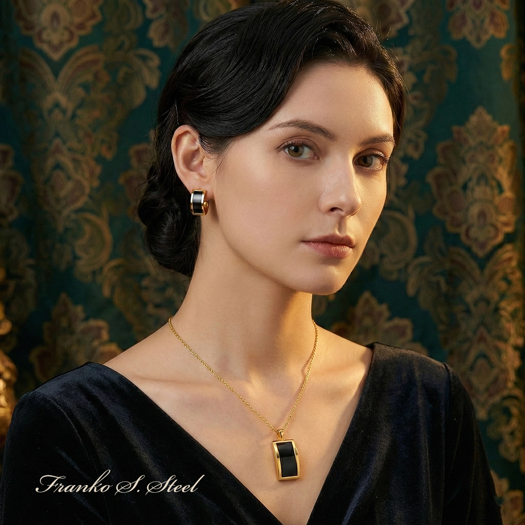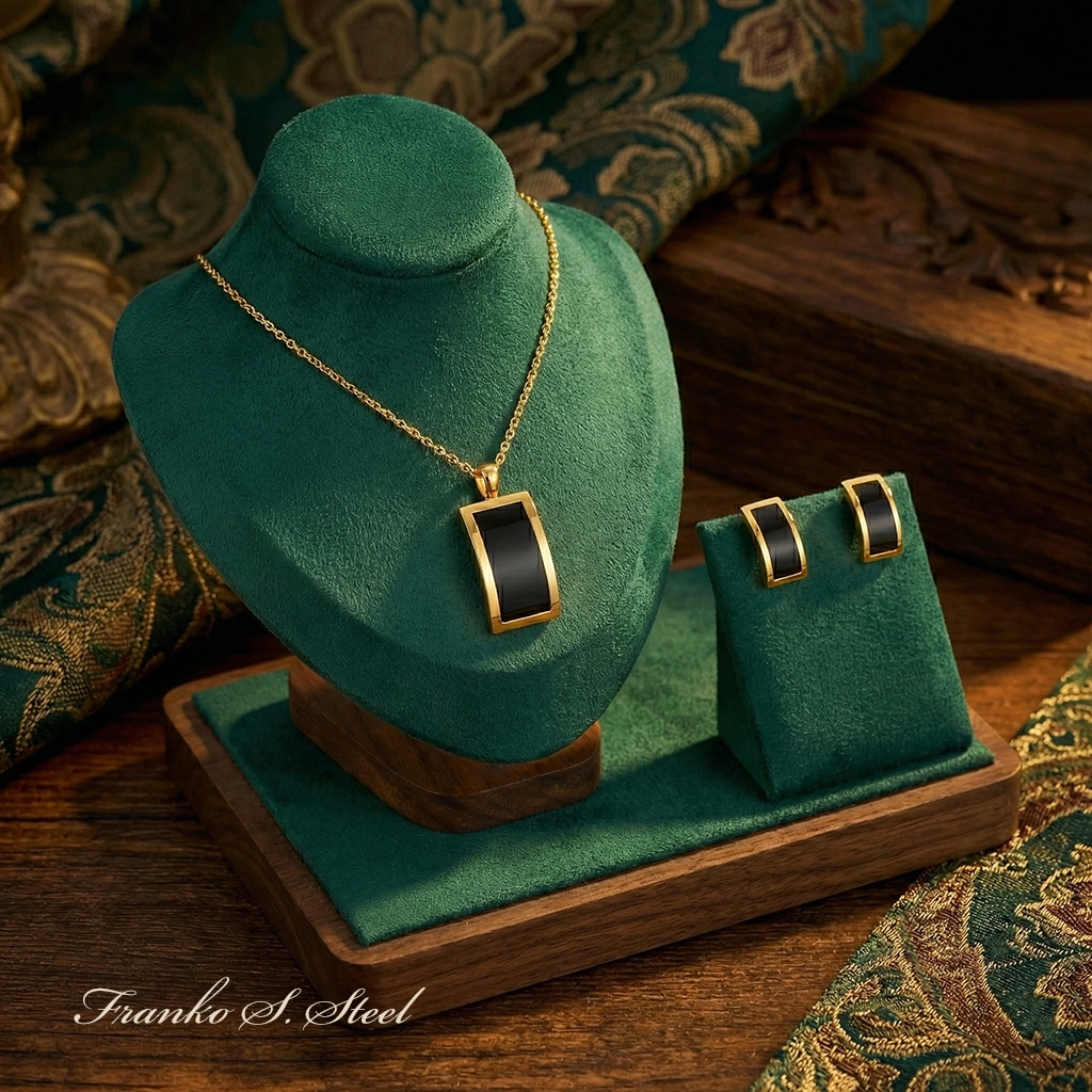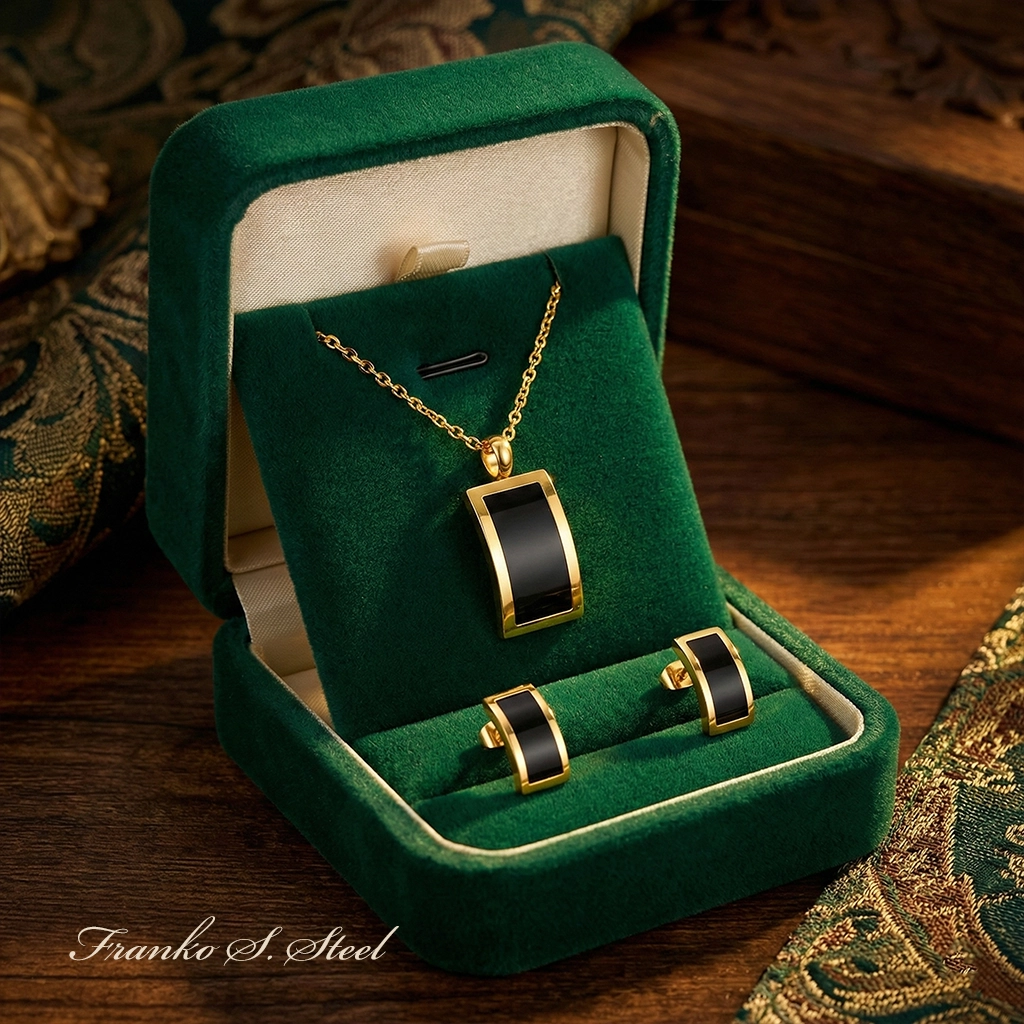 Poznaj wyjątkowy zestaw biżuterii, który łączy w sobie ponadczasowy blask złota z głębią czerni. Komplet wykonany jest z trwałej stali chirurgicznej w kolorze złota, co zapewnia mu nie tylko luksusowy wygląd, ale także wysoką odporność na ścieranie i działanie wody. Geometryczny wzór z czarnym wypełnieniem (imitacja onyksu) w złotej oprawie prezentuje się niezwykle szykownie. To idealny dodatek dla kobiet ceniących wyraziste, ale eleganckie akcenty. Świetnie sprawdzi się jako dopełnienie „małej czarnej” lub eleganckiej koszuli.