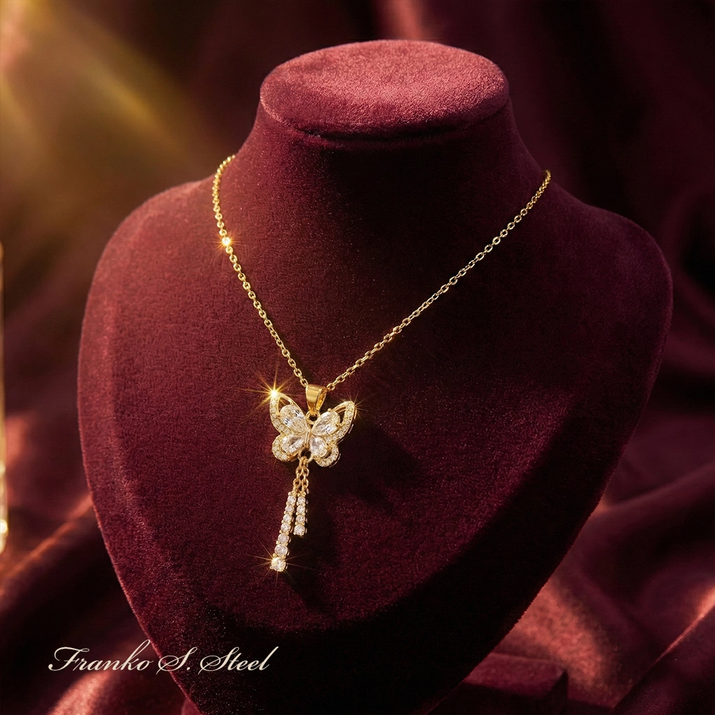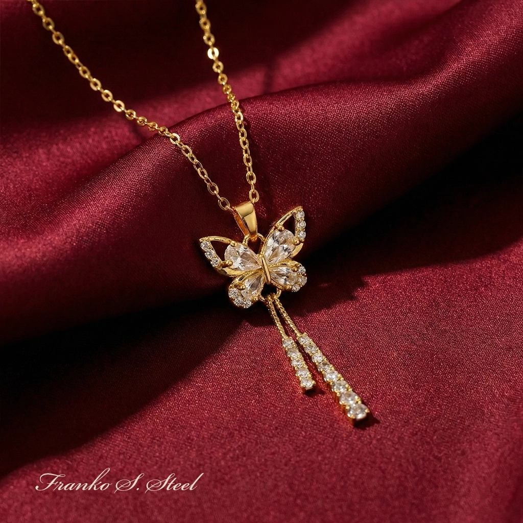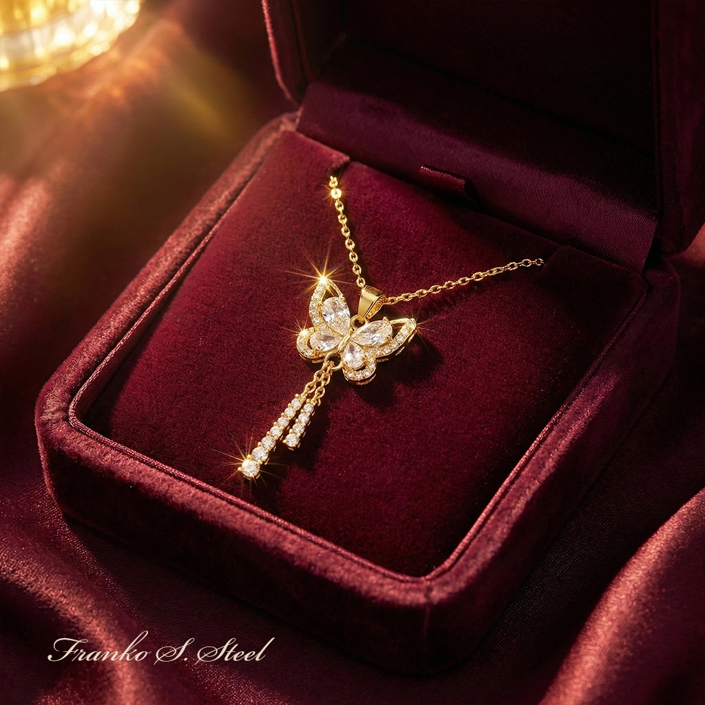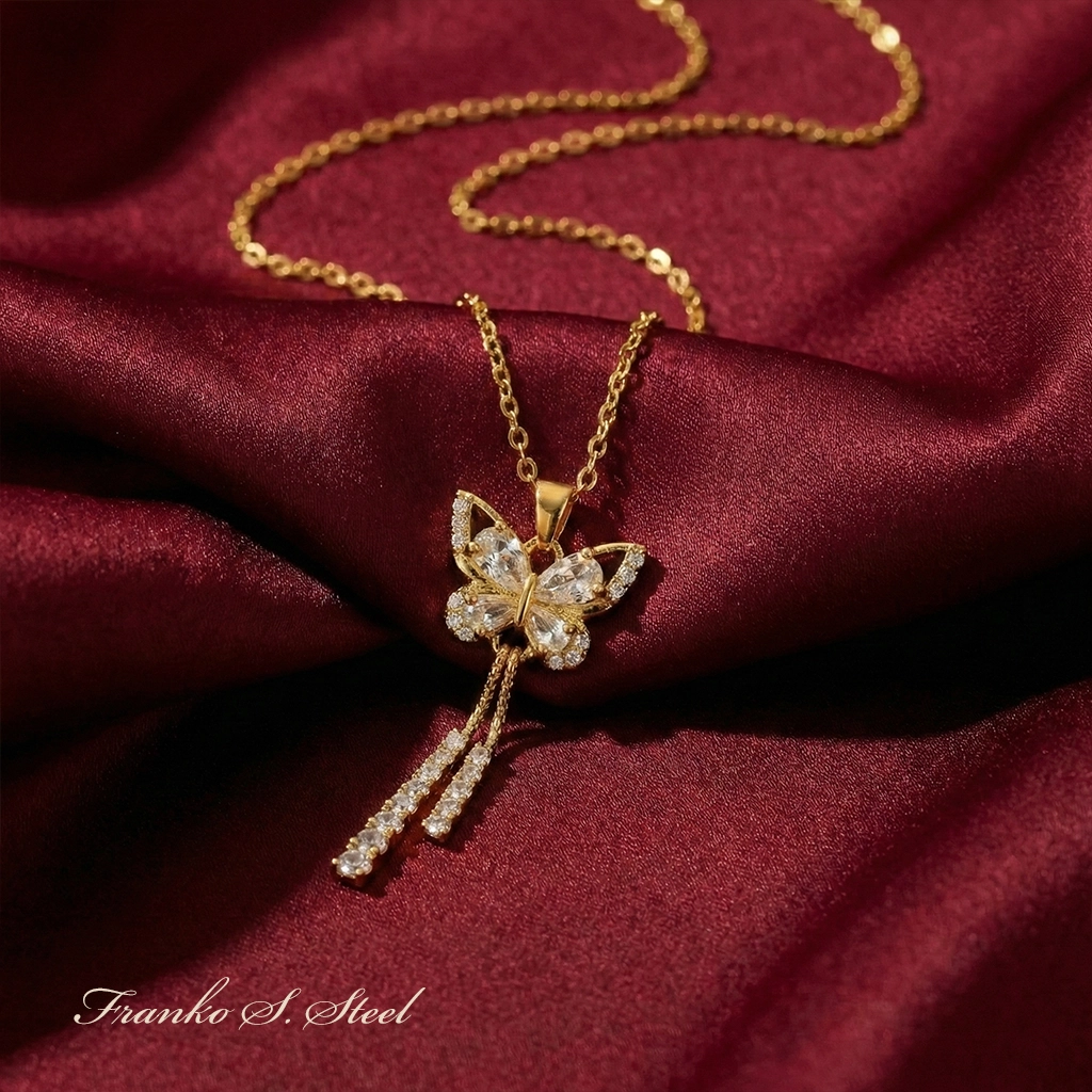 - Efektowny design: Zdobiony błyszczącymi cyrkoniami ułożonymi w kształt motyla z ozdobnymi, wiszącymi łańcuszkami, które dodają lekkości i blasku.