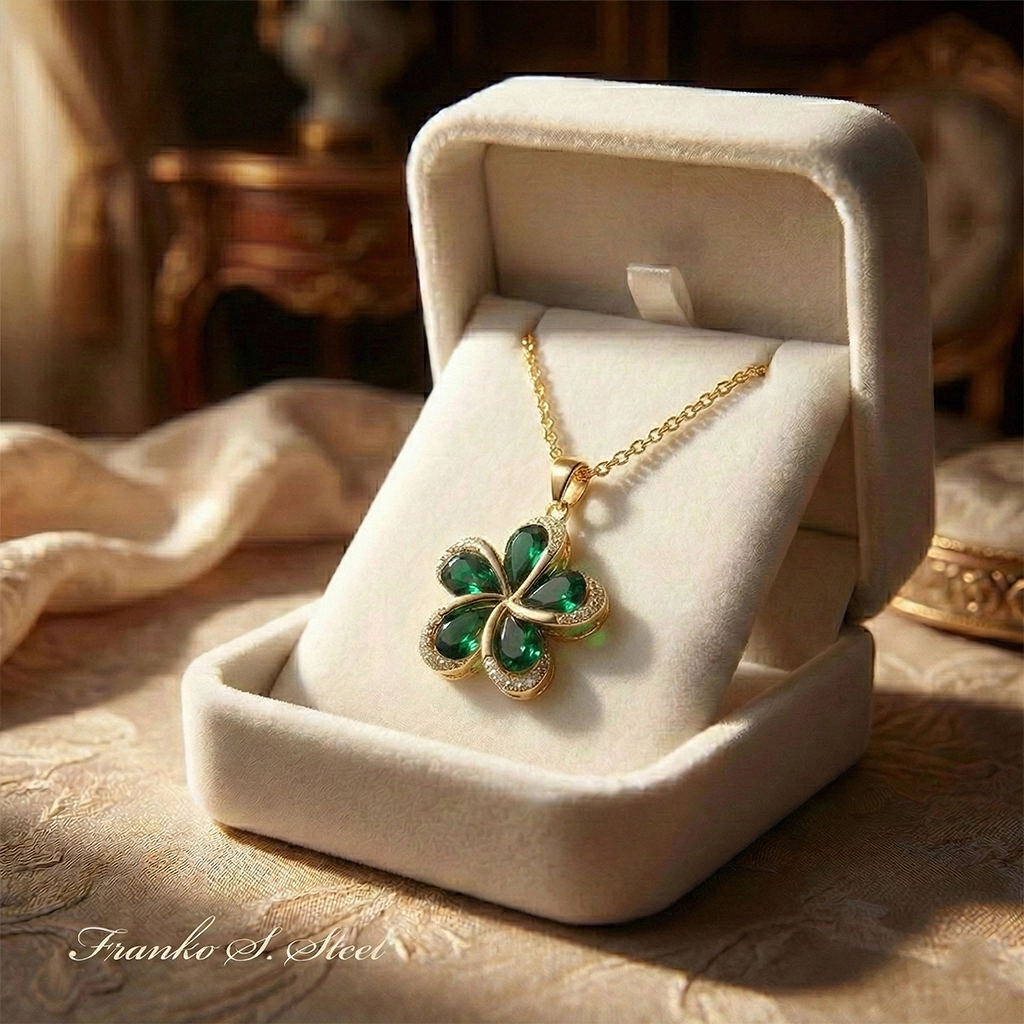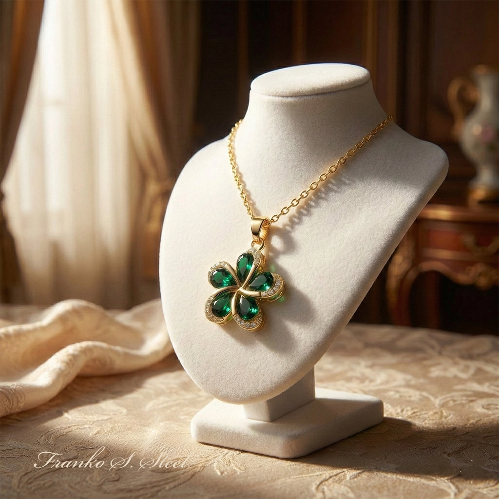 Opis przedmiotu: Prezentujemy niezwykle elegancki naszyjnik z zawieszką w kształcie kwiatu, który zachwyca swoją głęboką barwą. Kompozycję tworzy pięć cyrkonii o szlifie łezki w kolorze szmaragdowej zieleni (butelkowa zieleń). Każdy płatek jest subtelnie podkreślony złotą oprawą wysadzaną rzędem mniejszych, przejrzystych kryształków, co dodaje całości luksusowego charakteru i pięknego blasku.