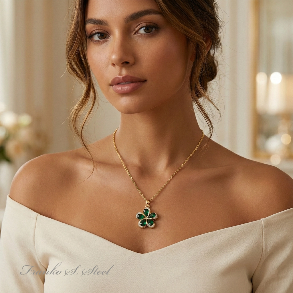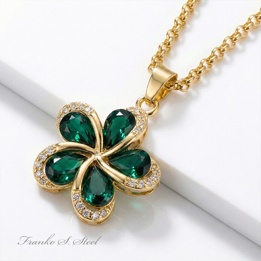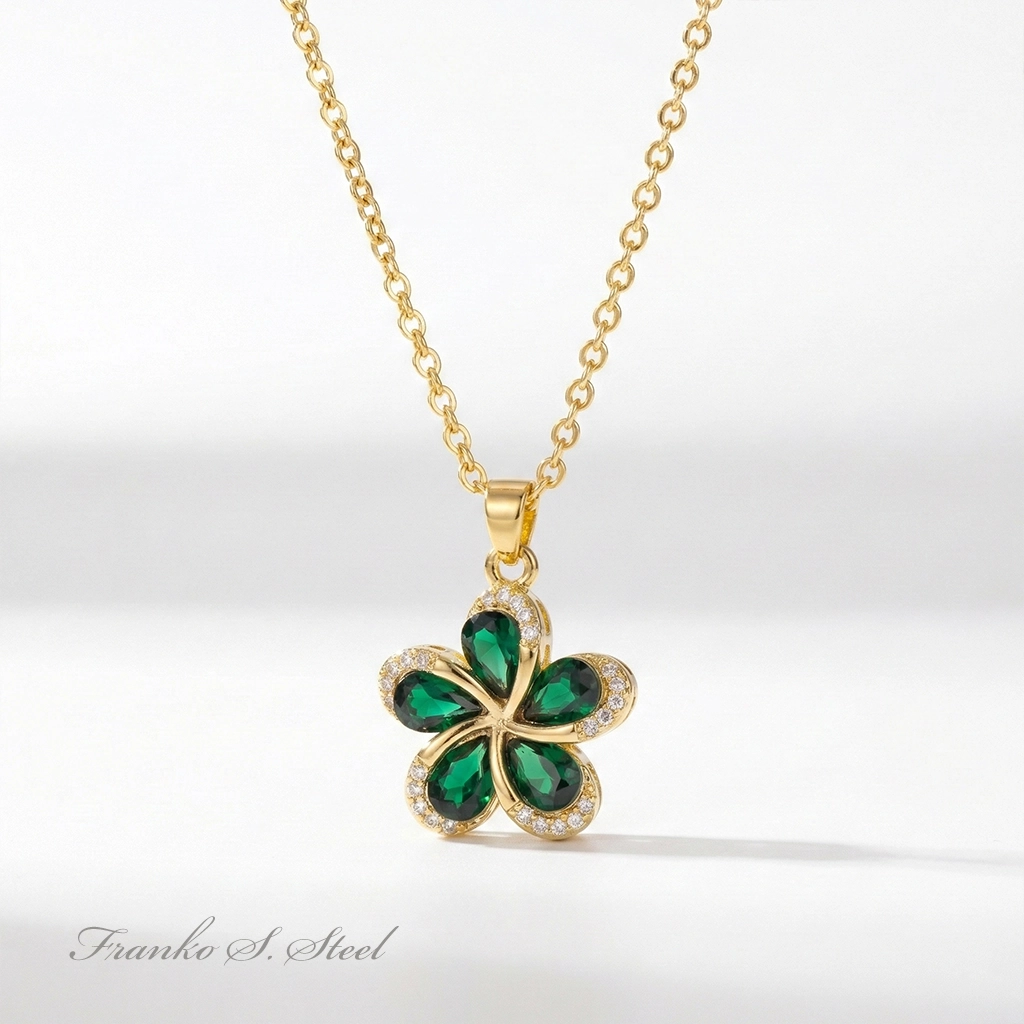 NASZYJNIK ZŁOTY NSN04 STAL CHIRURGICZNA KWIAT SZMARAGDOWY ZIELONY CYRKONIE PREZENT 316L
