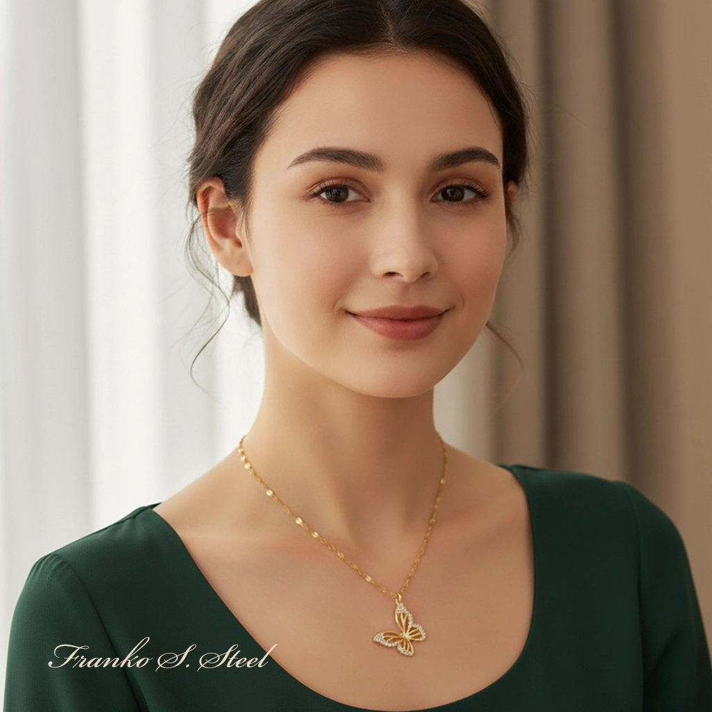 Opis przedmiotu: Oferujemy niezwykle subtelny i kobiecy naszyjnik z zawieszką w kształcie motyla. Wyróżnia się on lekką, ażurową konstrukcją – skrzydła nie są pełne, lecz tworzą delikatne, złote ramy wypełnione powietrzem. Kontury skrzydeł zostały precyzyjnie ozdobione rzędem lśniących cyrkonii, które dodają biżuterii elegancji, nie przytłaczając jej.
