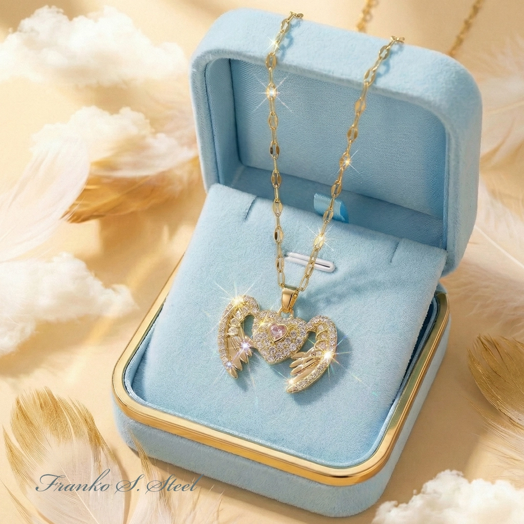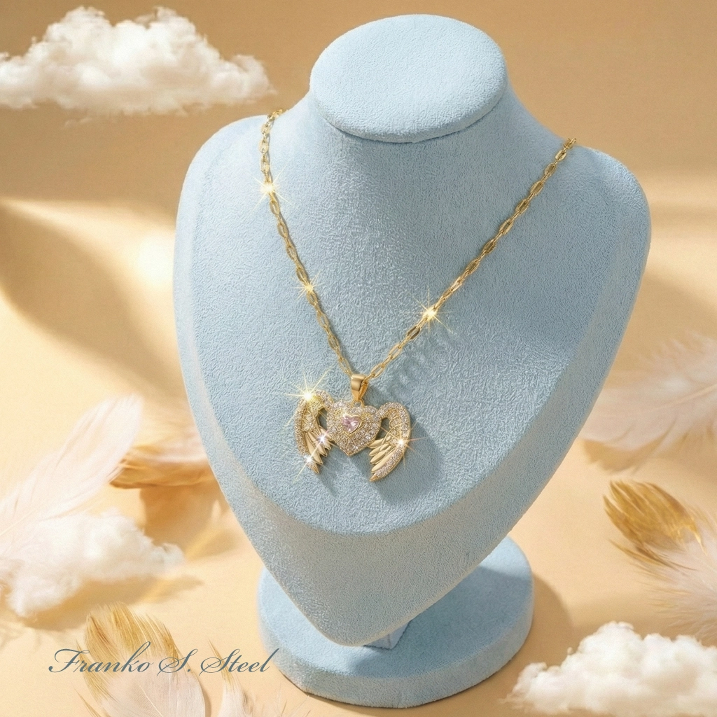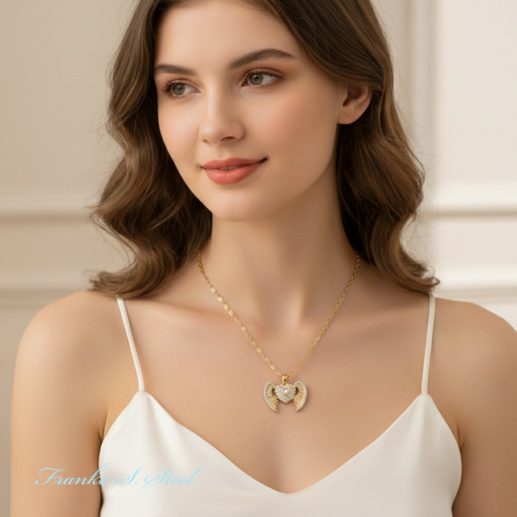 Opis przedmiotu: Prezentujemy zachwycający naszyjnik, który łączy w sobie symbolikę miłości i opieki. Głównym motywem jest serce otoczone anielskimi skrzydłami, co może symbolizować uczucie, które „dodaje skrzydeł”, lub obecność anioła stróża. Cała powierzchnia zawieszki – zarówno serce, jak i pióra skrzydeł – jest gęsto wysadzana przejrzystymi, lśniącymi cyrkoniami.