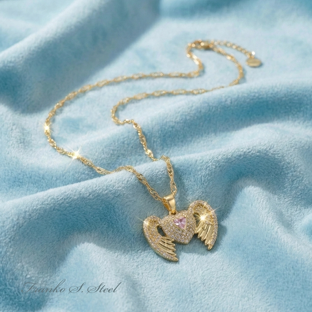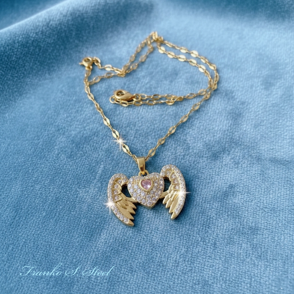 NASZYJNIK ZŁOTY NSN12 STAL CHIRURGICZNA SERCE SKRZYDŁA ANIOŁ RÓŻOWY CYRKONIE 316L