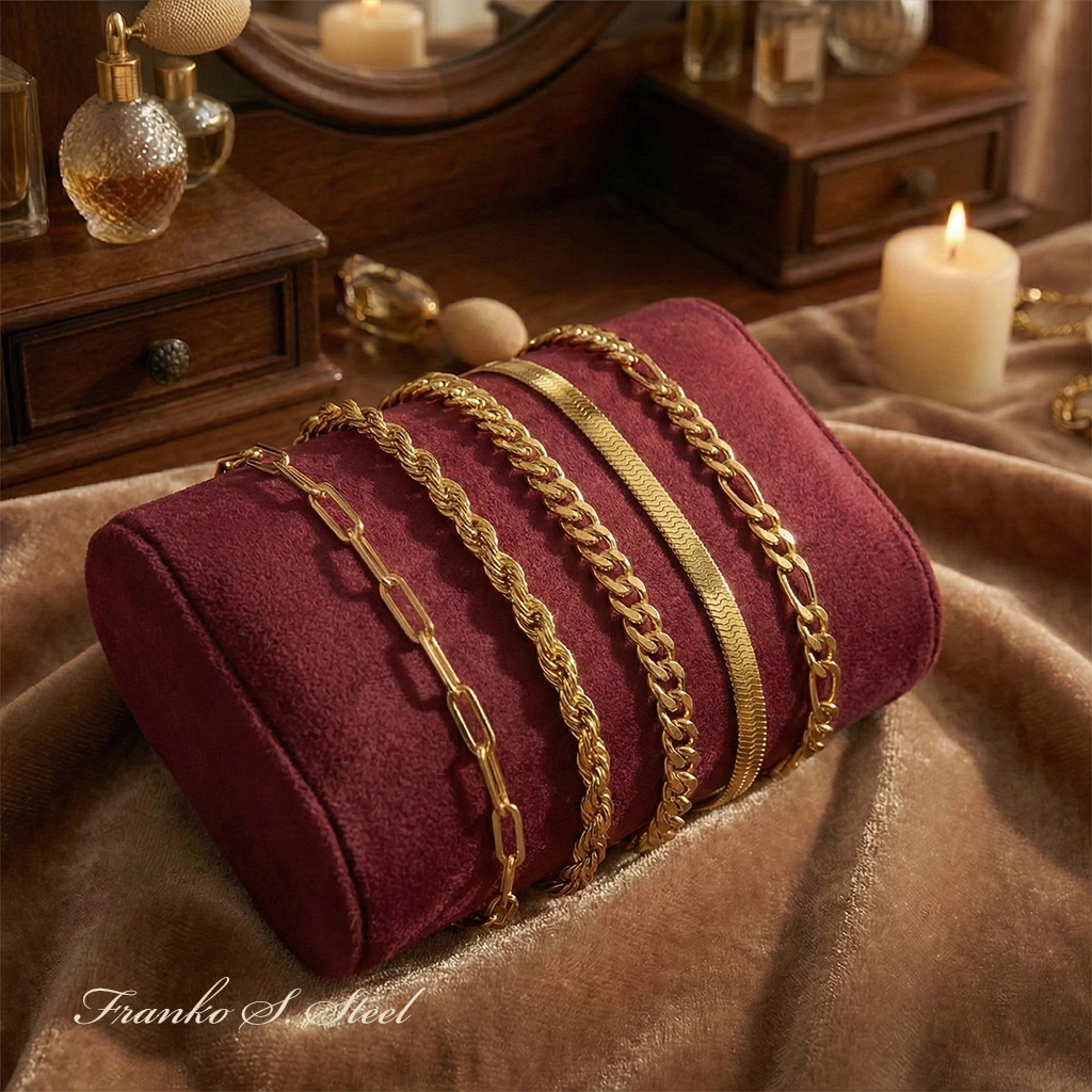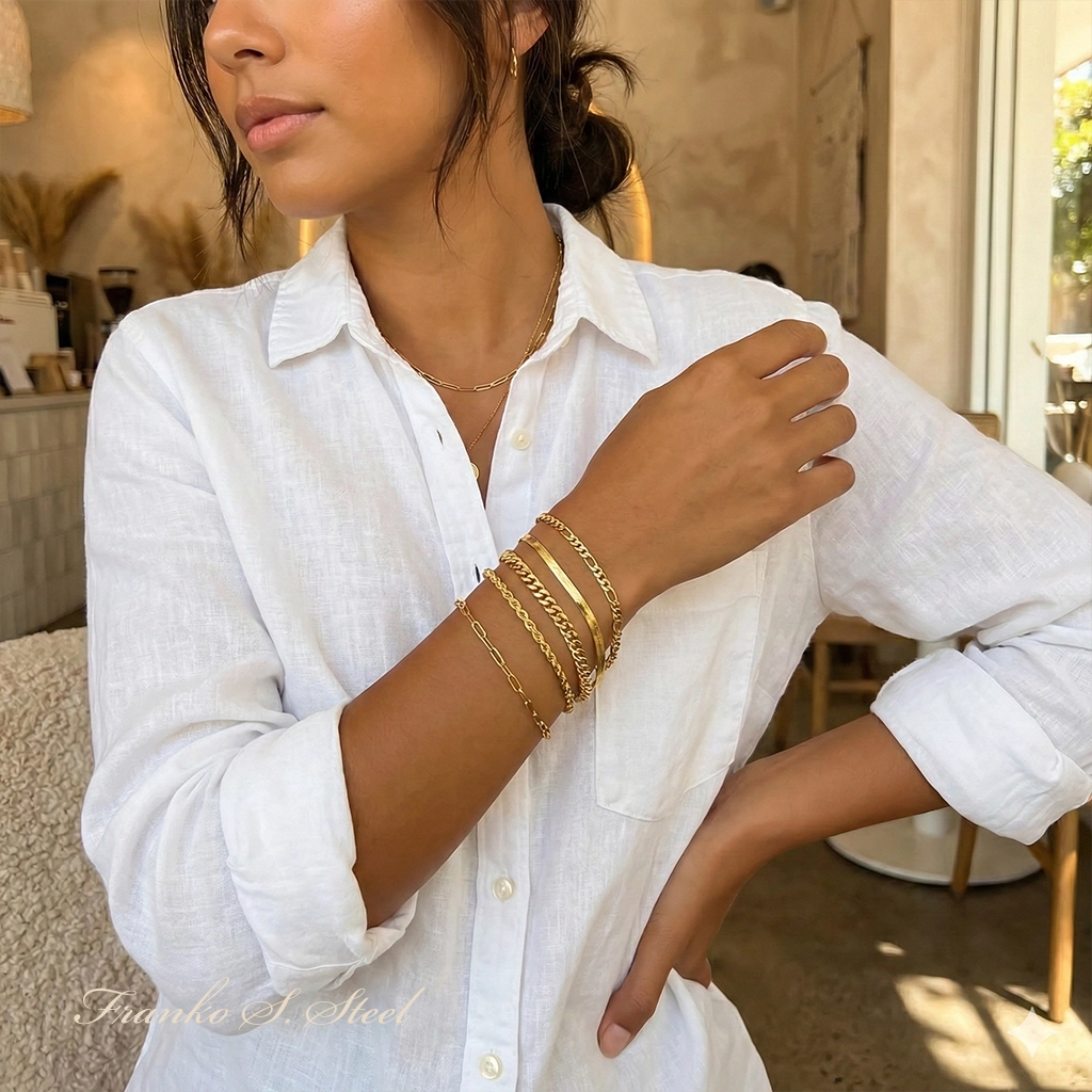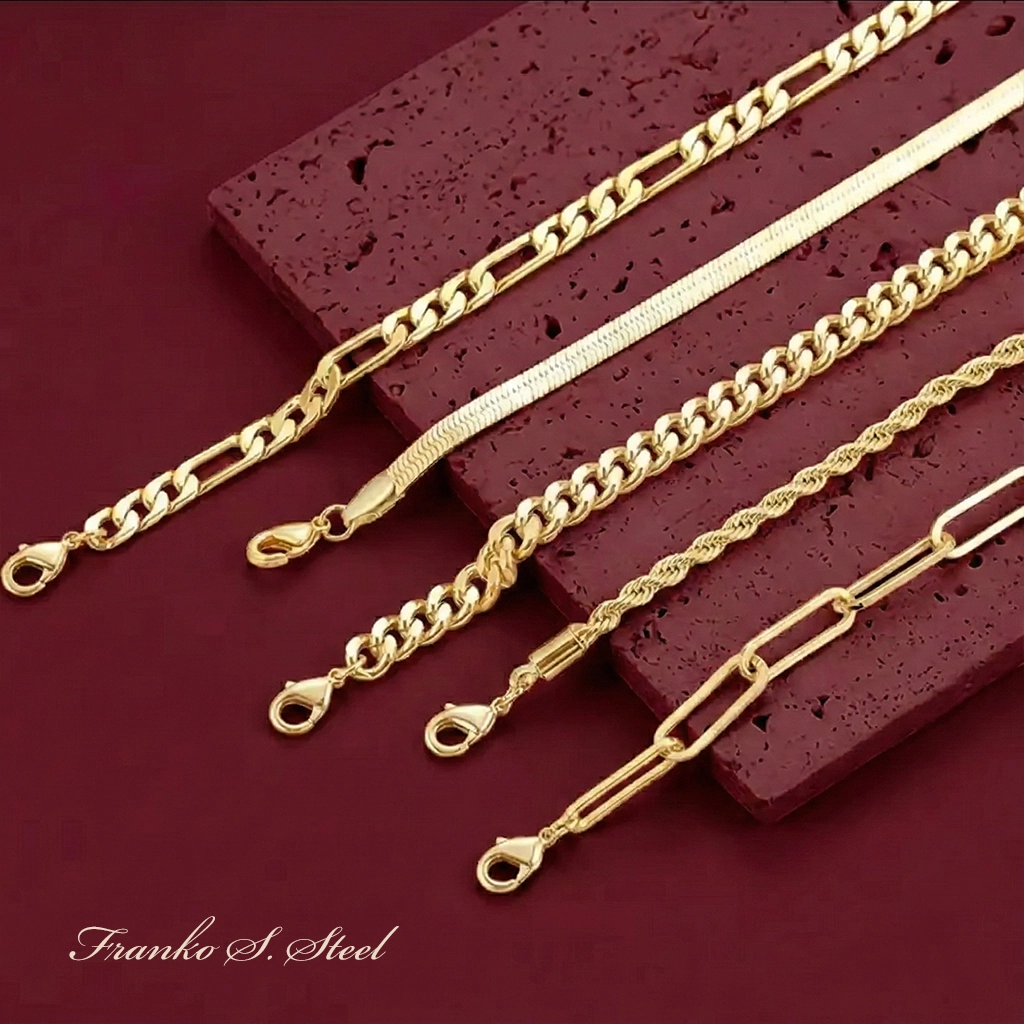 Prezentujemy wyjątkowy zestaw pięciu bransoletek wykonanych z wysokiej jakości stali chirurgicznej, pokrytej trwałym złoceniem. Ten stylowy komplet w kolorze złota to idealny dodatek do każdej stylizacji, dodający jej ciepłego blasku i luksusowego charakteru. Możesz nosić je razem, tworząc modny, bogaty efekt „warstwowania”, lub każdą bransoletkę osobno. Stal chirurgiczna jest hipoalergiczna i zapewnia trwałość biżuterii.